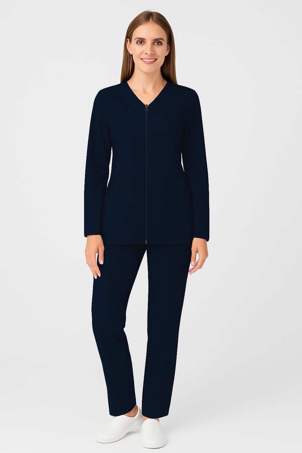 Halatul are un anchior elegant (decolteu în V), închidere cu fermoar și buzunare funcționale, fiind gândită pentru un aspect curat și profesionist. Pantalonii cu talie elastică completează perfect setul, oferind libertate de mișcare și o potrivire perfectă.