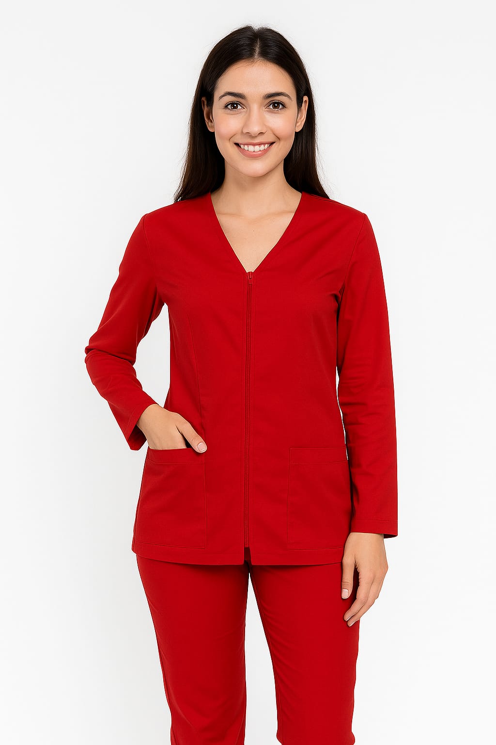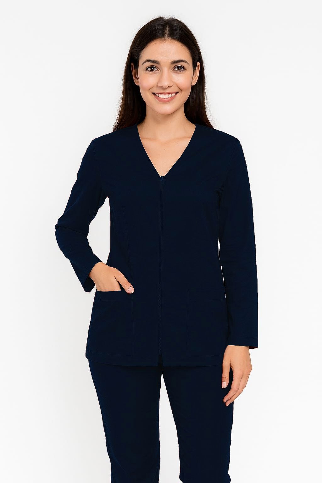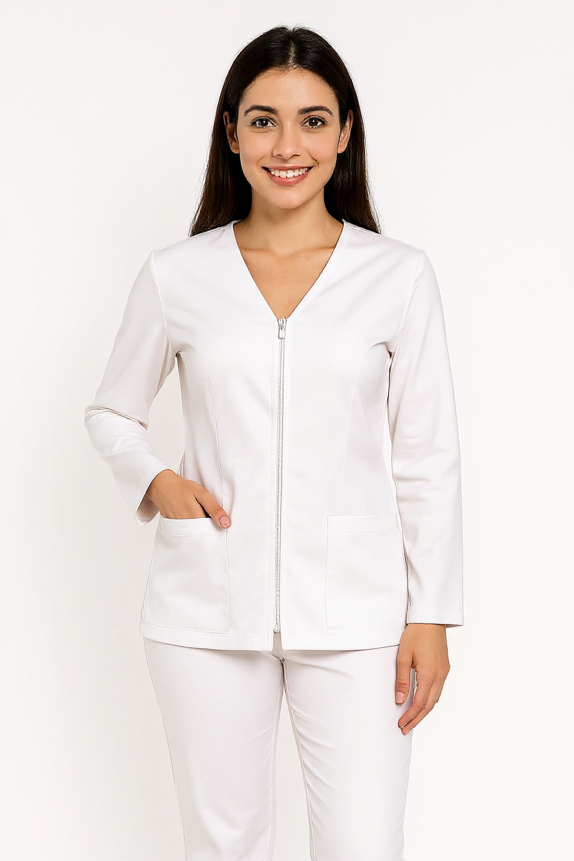 Designul modern, cu decolteu în V și croială cambrată, pune în valoare silueta feminină, oferind în același timp libertate deplină de mișcare. Fermoarul adaugă un plus de eleganță și practicitate, iar buzunarele frontale completează perfect funcționalitatea uniformei.