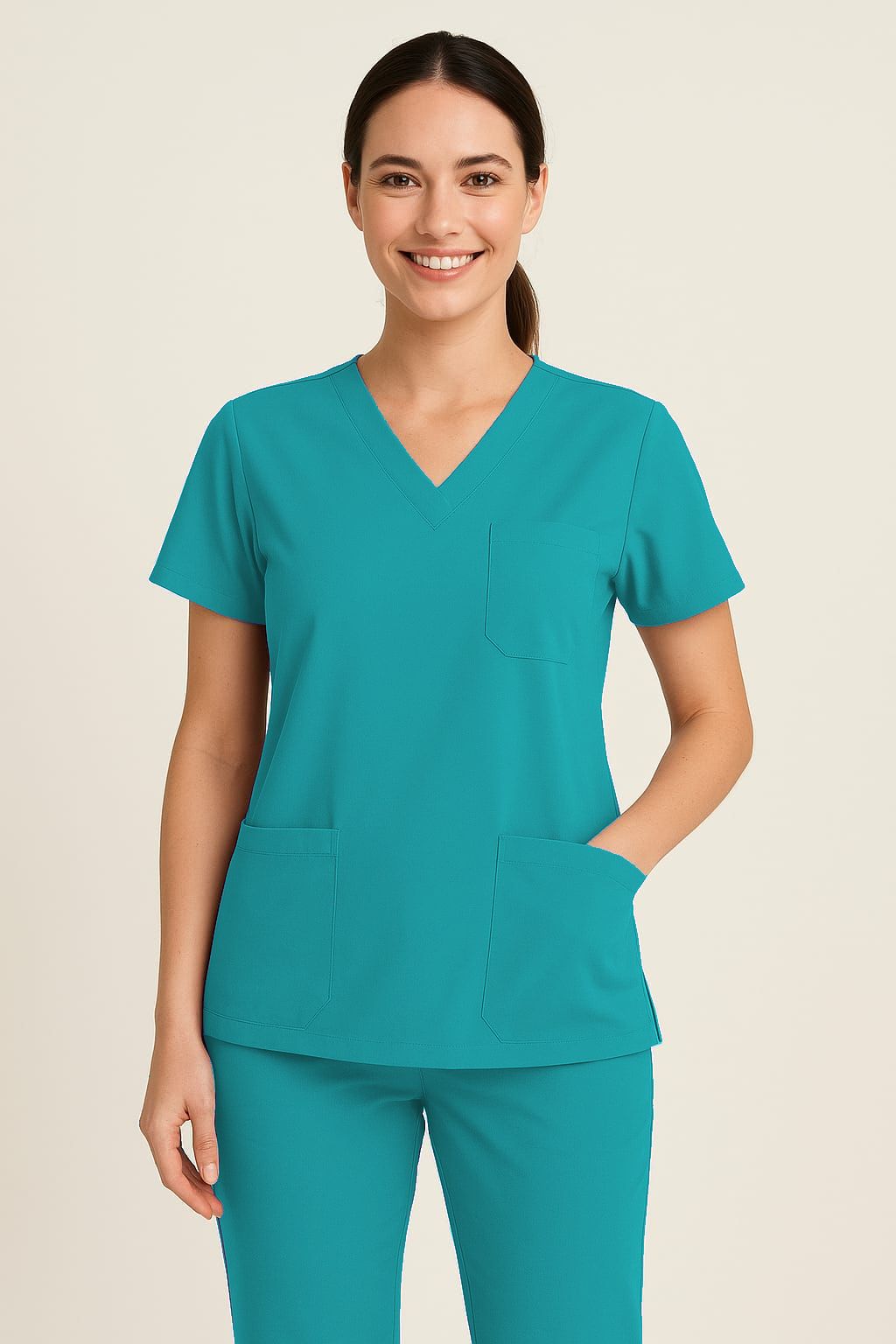 Designul clasic, cu decolteu în V și croială lejeră, oferă libertate de mișcare și o potrivire perfectă pentru orice siluetă. Țesătura fină din bumbac și poliester permite pielii să respire, fiind ideală pentru purtare zilnică, chiar și în cele mai solicitante medii de lucru.